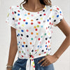 Ladies' Contrasting Color Polka Dot Print Front Tie Petal Sleeve Round Neck Hollowed Out Button Detail Design Casual Style Shirt Top