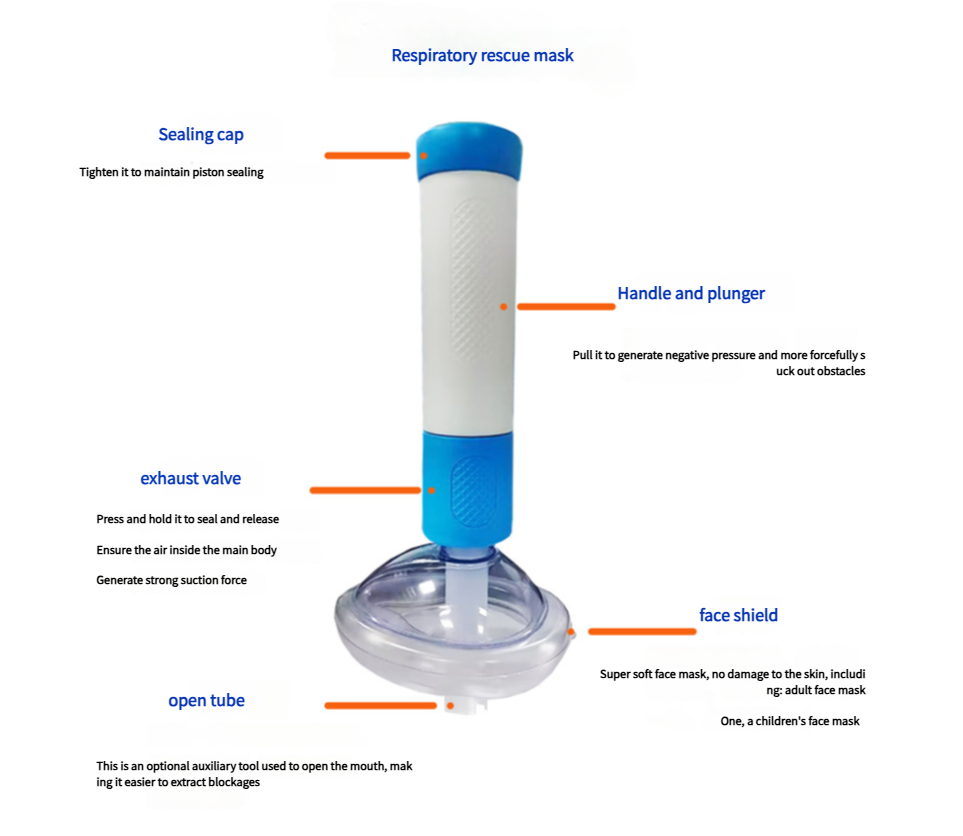 2.It consists of a sealing cap, a handle and piston, an exhaust valve, an opening tube and a mask.