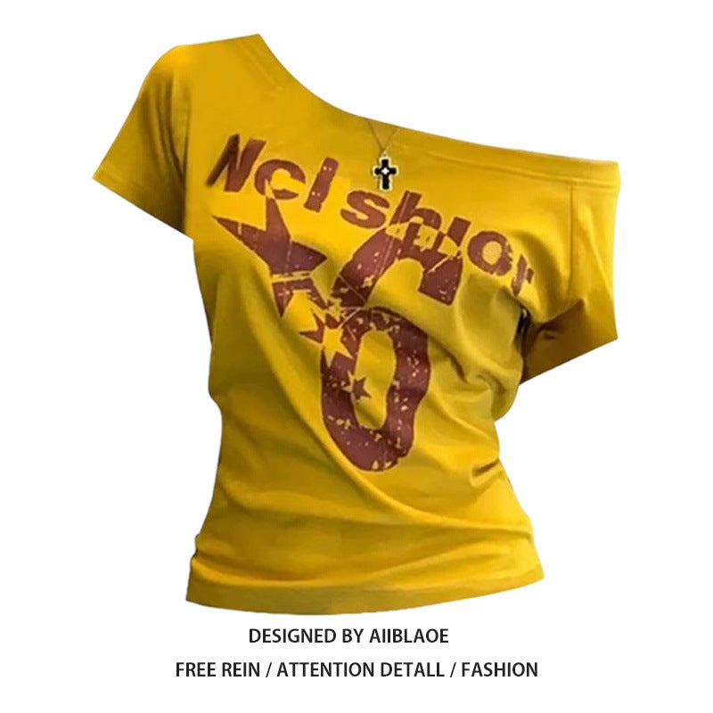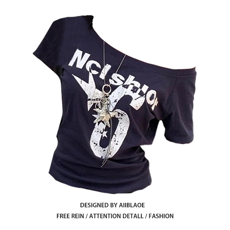 Oblique Shoulder Printed Short Sleeve Summer Slim-fit Crop-top