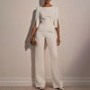 Women's Elegant Round Neck Jumpsuit - Mid-Sleeve With Side Slit Cuffs & Pearl Accents, Back Zipper Design For Casual To Formal Events