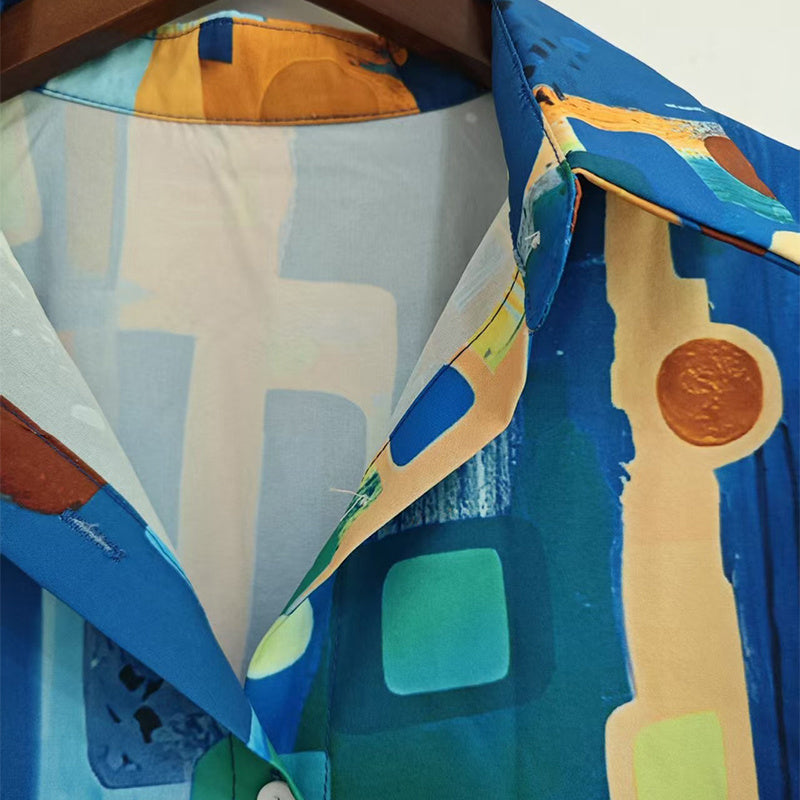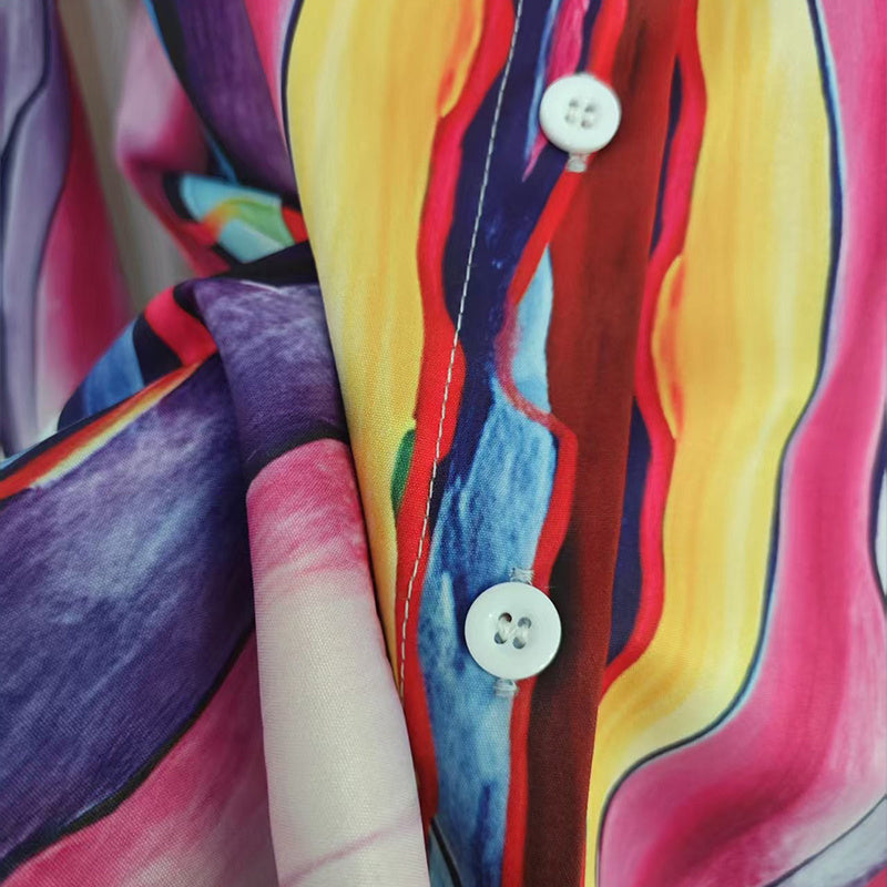 Brighten your spring and summer wardrobe with this vibrant printed women's lapel collar shirt , featuring eye-catching colorful patterns that radiate vacation vibes. The classic button-up design with long sleeves offers versatile styling options, while the 100% polyester fabric ensures lightweight comfort perfect for warm-weather wear.